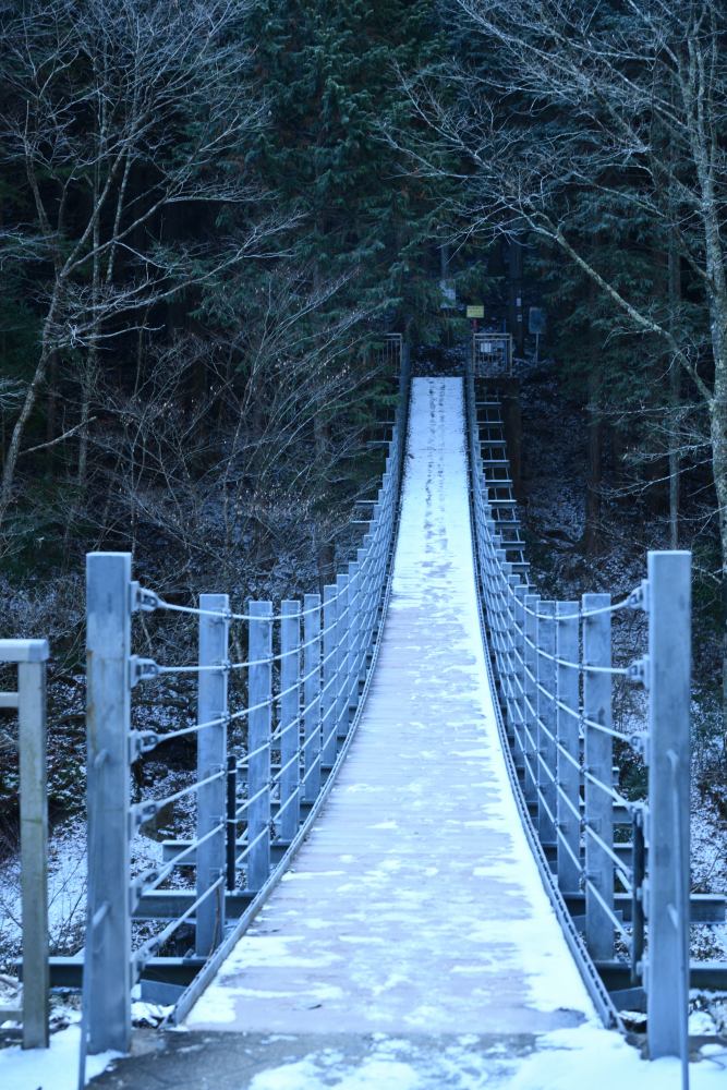 登山口に架かる吊り橋には、