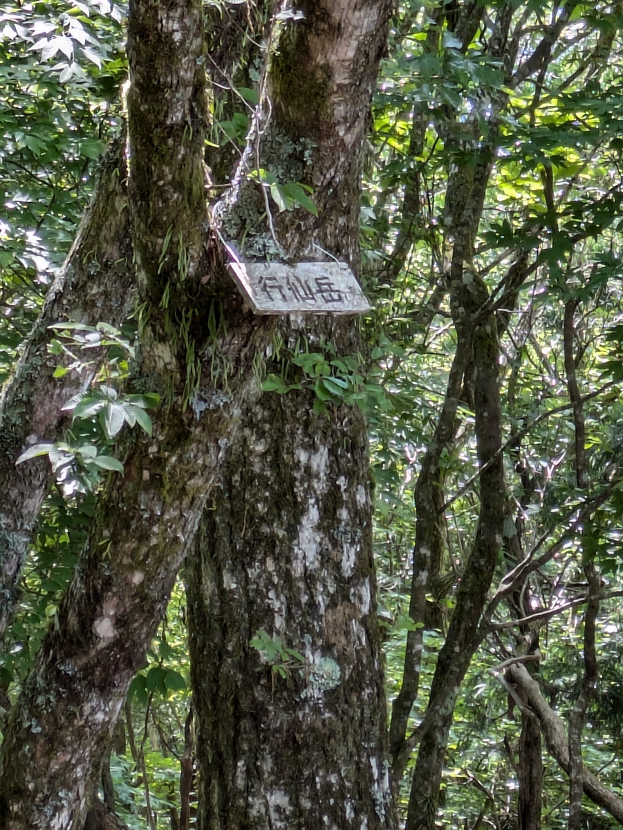 新川津大橋[車]~(10:45)今西側古道入口(10:50)~(11:45)崩壊地(11:55)~(12:15)古道入口[昼](12:40)~(12:56)行仙岳登山口(13:00)~(13:05)道標地蔵尊~(14:10)行仙岳(14:45)~(15:30)行仙岳登山口